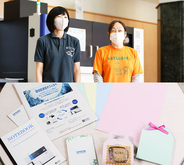 左:NPO法人「わくわーく」のスタッフ 右:再生紙を利用したアップサイクル品