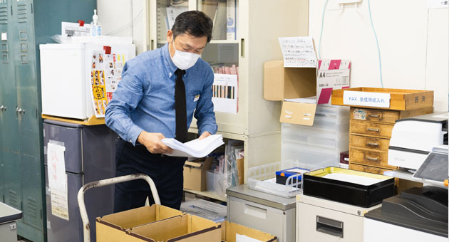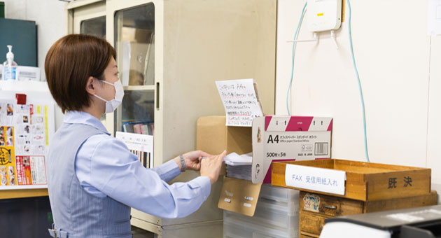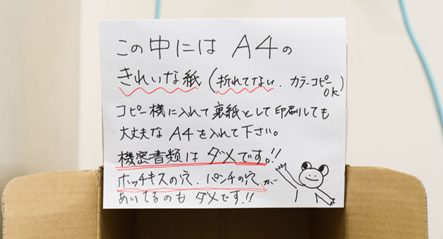 最初に取り組んだのは、アップサイクル品を制作するための古紙を収集する専用ボックスを作ることでした。今までは全館約30ヵ所に設置された「古紙回収ボックス」に古紙を入れ、ある程度集まったらまとめて古紙回収業者へお渡ししていたのですが、その「古紙回収ボックス」の他に「アップサイクル用ボックス」を設けたんですね。アップサイクル用ボックスに入れる紙は、ステープラーやパンチの穴のないもの、紙の端が折れていないものなど製紙しやすい状態の紙に限られます。この作業は、実は社員にとっては手間がかかるものなんですね。面倒くさいなあと感じている社員もいるのではないかと思います。でも一人ひとりが協力してこの作業に取り組むことがどういう結果に繋がるのかを考えるいい機会になると私は信じています。